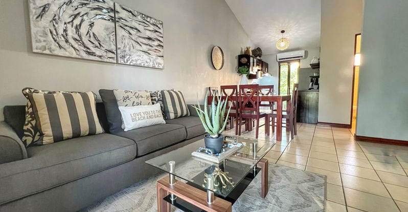 Jade Beach C54 is a beautifully renovated second-floor condominium located in the sought-after Las Palmas neighborhood of Playas del Coco. This 2-bedroom, 2-bathroom unit offers a bright and airy feel with vaulted ceilings and an open-concept living space, fully updated with modern furnishings, fresh paint, and new appliances. The fully equipped kitchen flows seamlessly into the living and dining areas, creating a comfortable and functional space for everyday living.